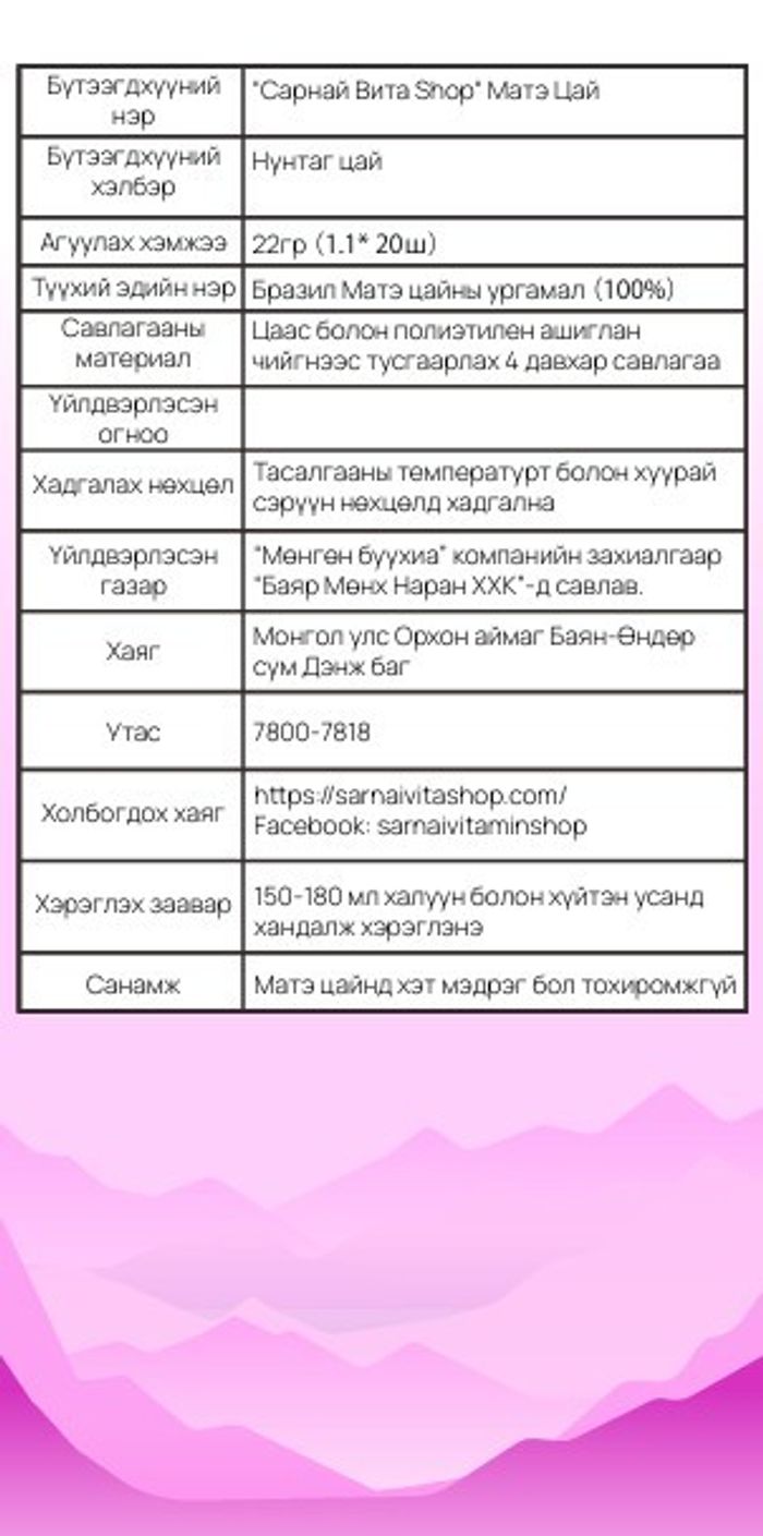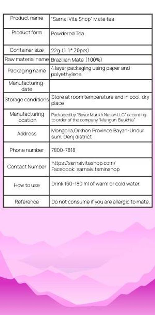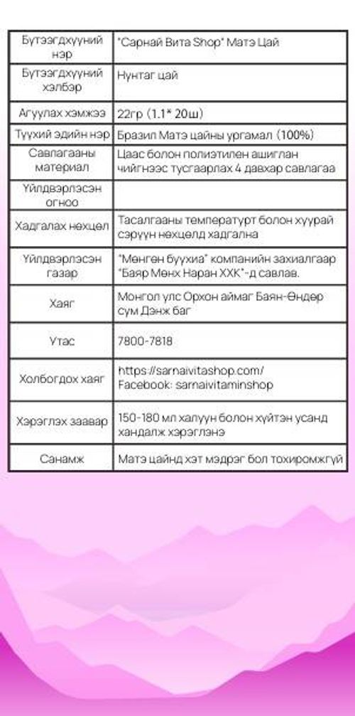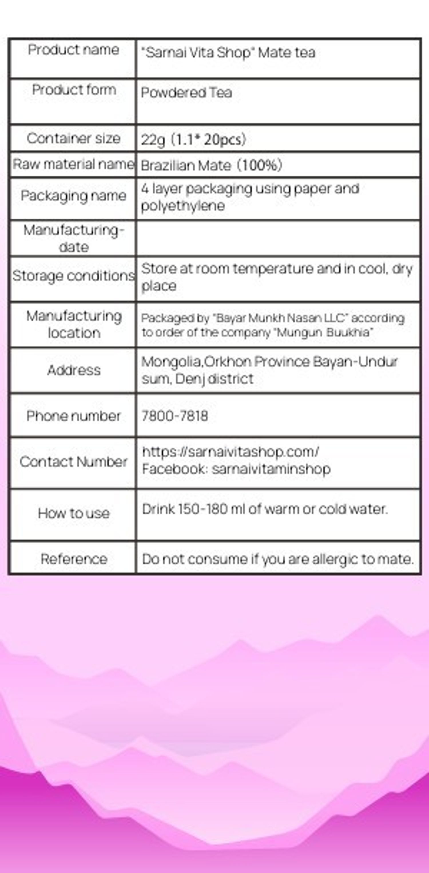 Сарнай вита шопын Матэ цай 1гр-аар 20ш-тэй савлагдсан.